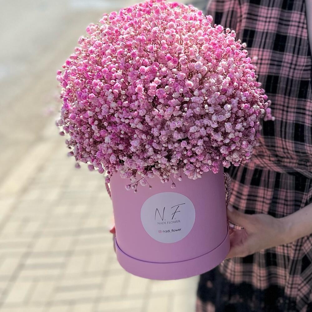 Коробка шляпная – 1 шт.Открытка – 1 шт.Оазис флористический – 2 шт.гипсофила цветная – 13 шт.