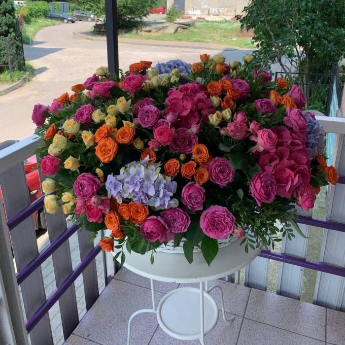 Гортензия – 10 шт.пионовидные розы кустовые Misty Bubbles – 20 шт.розы кустовые кремовые – 15 шт.розы кустовые оранжевые – 15 шт.Пистация пучок – 5 шт.Корзина плетеная – 1 шт.Оазис флористический – 5 шт.