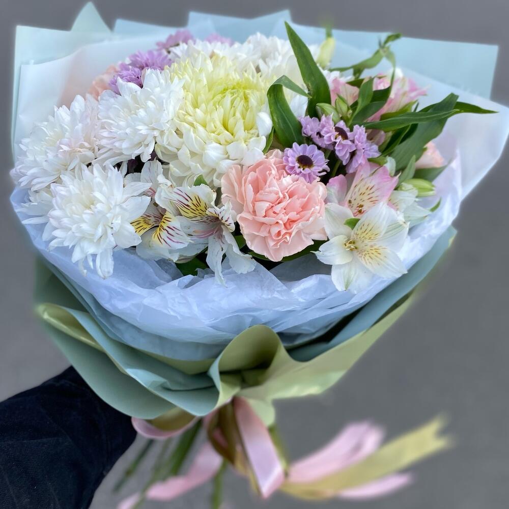 Альстромерия – 4 шт.Хризантема кустовая – 2 шт.Лента атласная – 5 шт.Диантус – 4 шт.Сантини – 3 шт.Упаковка дизайнерская – 7 шт.магнум белый – 1 шт.