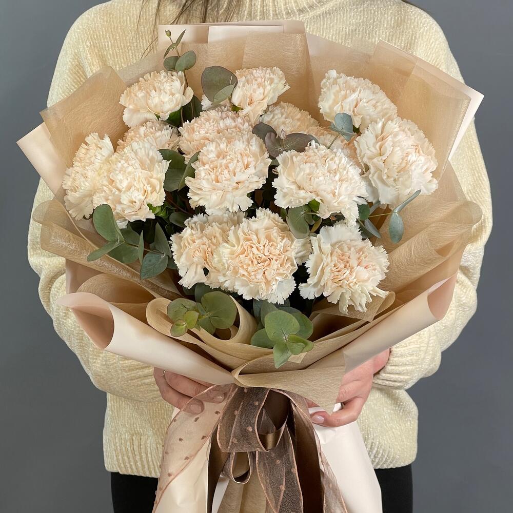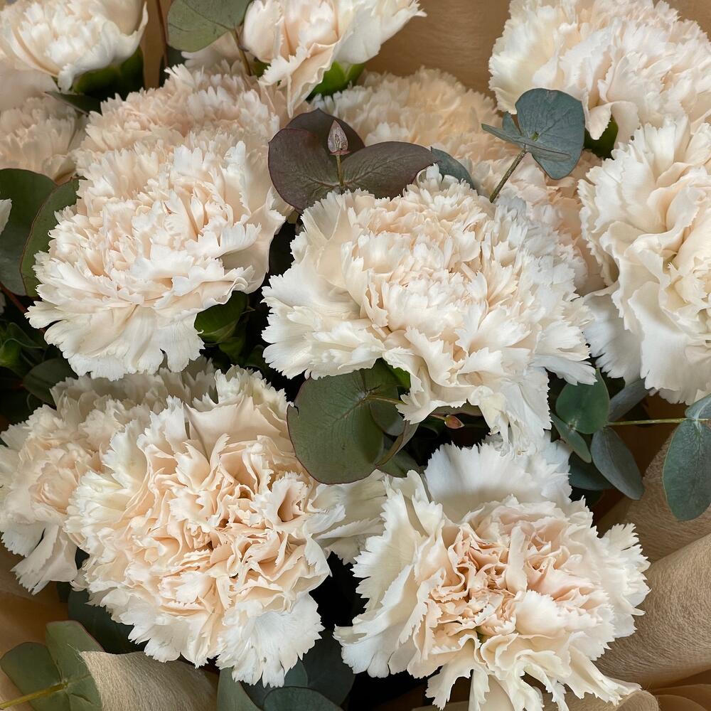 Лента – 2 шт.Эвкалипт – 2 шт.Гвоздика – 15 шт.Упаковка дизайнерская – 2 шт.