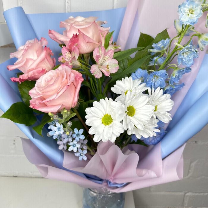 Роза Эквадор – 3 шт.Дельфиниум – 1 шт.Хризантема кустовая – 1 шт.Фисташка – 3 шт.Корейская упаковка – 3 шт.