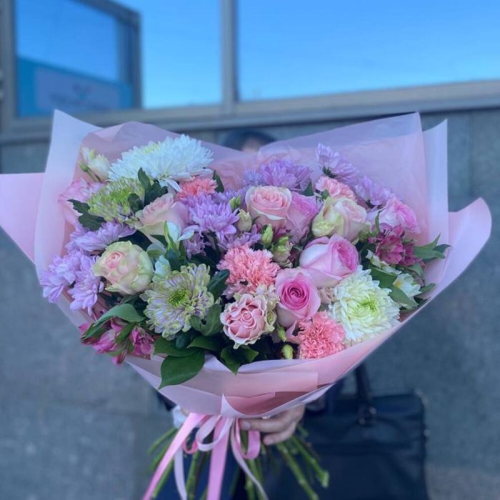 Альстромерия – 5 шт.Хризантема кустовая – 4 шт.Роза – 9 шт.Эустома – 2 шт.Лента атласная – 2 шт.Диантус – 5 шт.Хризантема одноголовая – 4 шт.Упаковка дизайнерская – 4 шт.