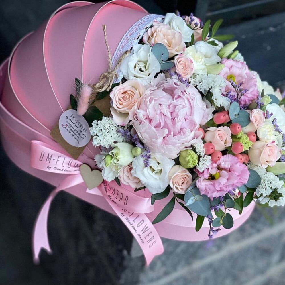 Пион – 1 шт.Кустовая роза – 2 шт.Эустома – 2 шт.Диантус – 3 шт.Лимониум – 1 шт.Статица – 1 шт.Гиперикум – 1 шт.Зелень – 1 шт.Коробка – 1 шт.Оазис флористический – 1 шт.ленты атласные – 2 шт.