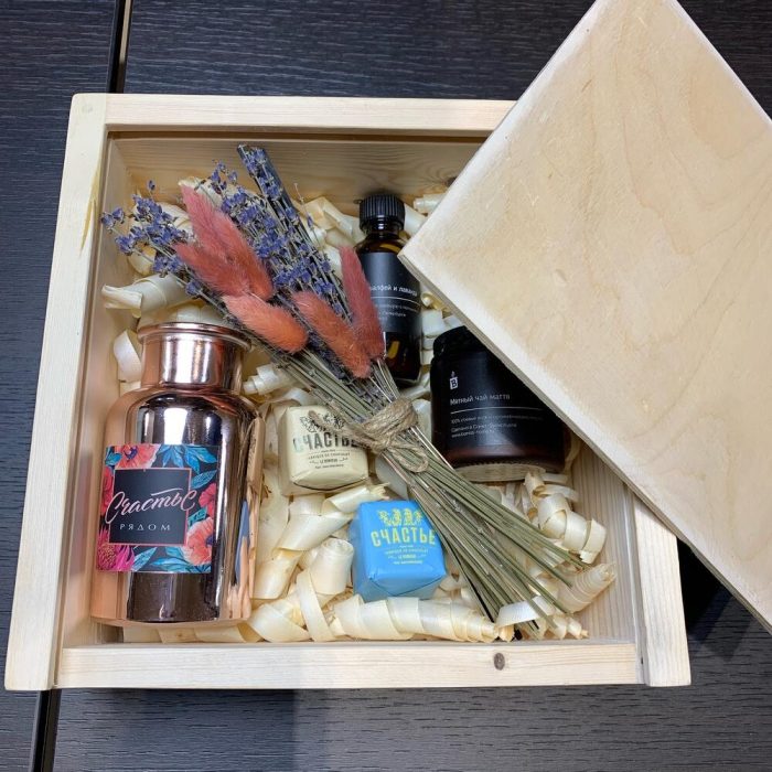 Ящик деревянный – 1 шт.Ваза стекло – 1 шт.букет сухоцветов (лаванда и лагурус1 шт.) – 1 шт.конфеты счастье 50г – 2 шт.свеча banca home в ассортименте – 1 шт.диффузор banca home – 1 шт.