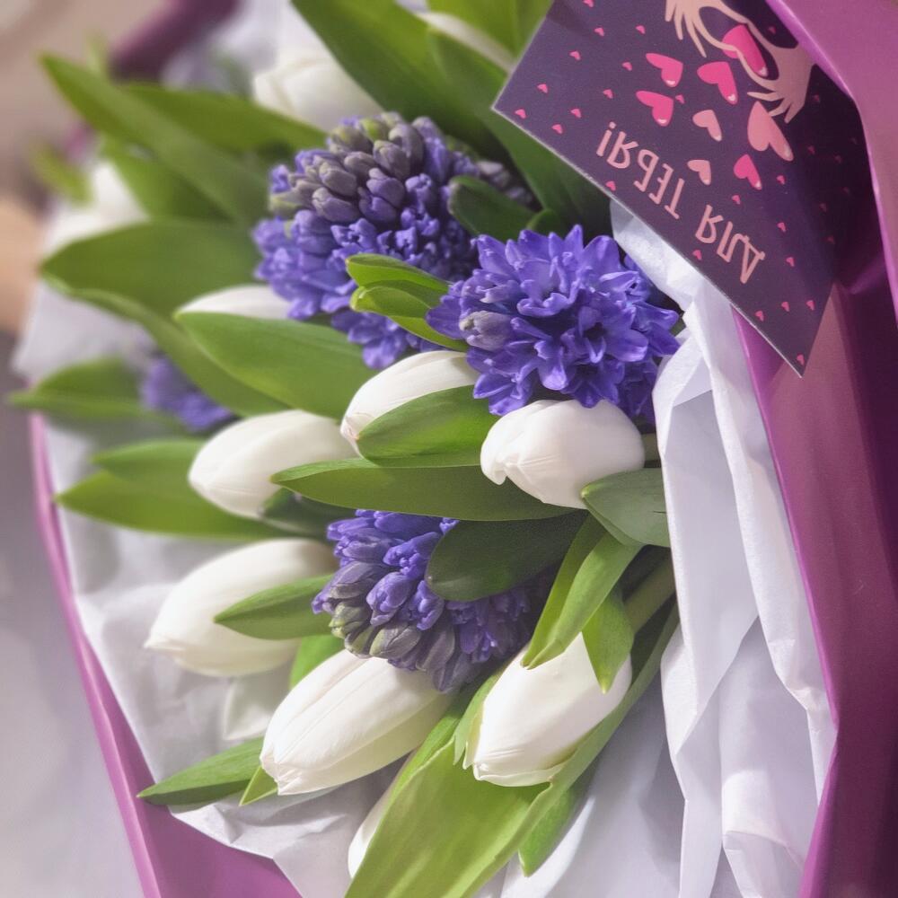 Лента атласная – 1 шт.Пленка матовая – 2 шт.Открыточка с вашими пожеланиями – 1 шт.Тишью белое – 3 шт.тюльпаны белые голландия – 12 шт.гиацинты синие – 5 шт.
