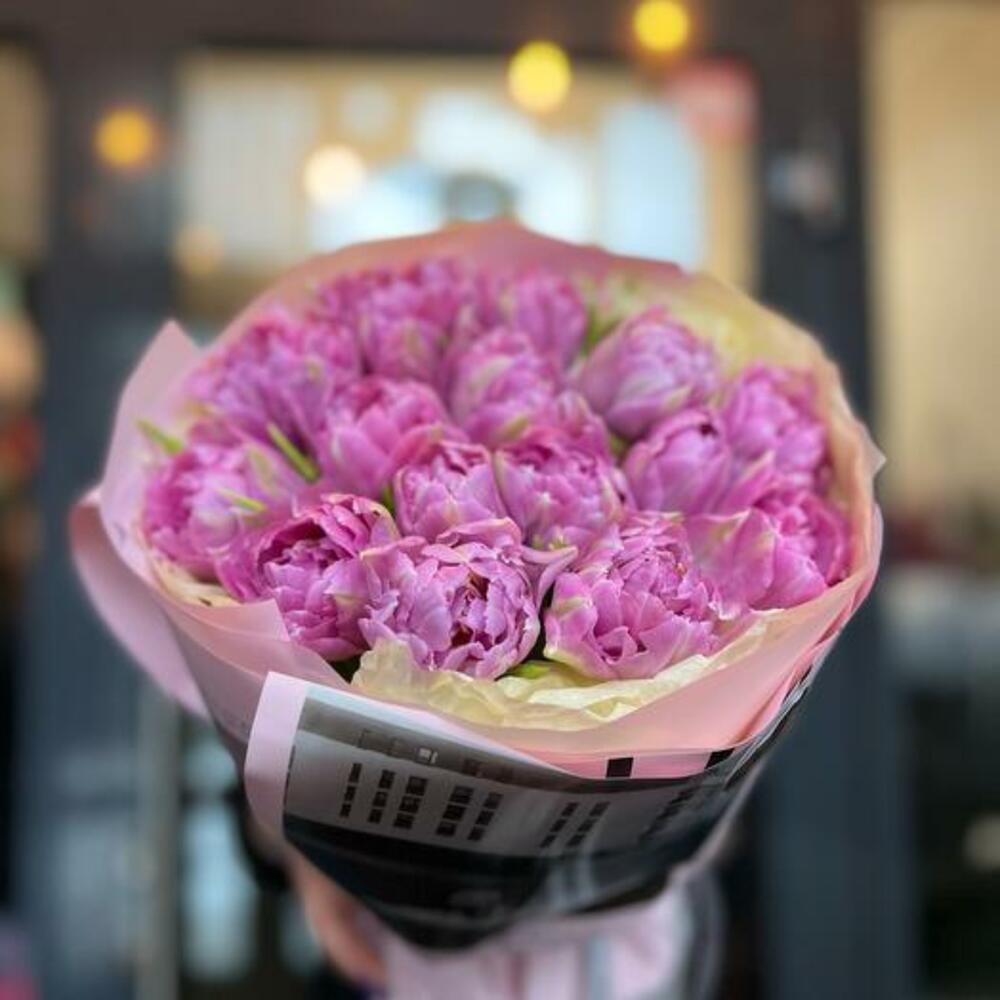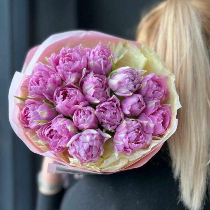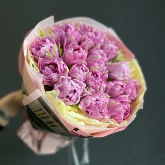 тюльпаны – 15 шт.декоративная упаковка – 1 шт.Атласная лента – 1 шт.